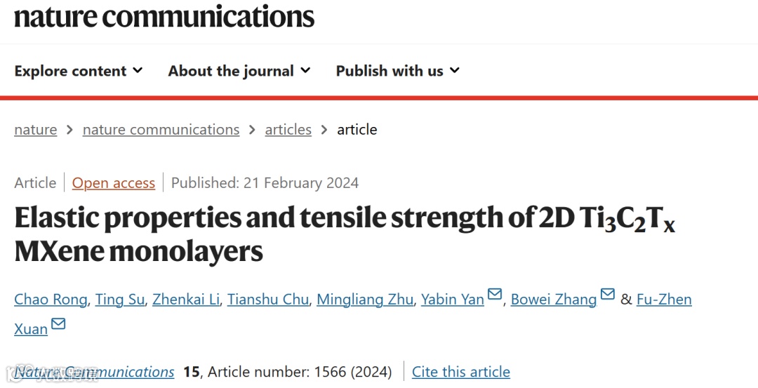 为了解决上述的科学问题,该团队通过单轴原位拉伸试验,可以直接在二维材料平面上进行均匀加载,这也是研究Ti3C2Tx 力学性能最有效的方法。研究团队采用精确控制的聚焦离子束切割技术和改进的干转移技术将高质量的大尺寸单层Ti3C2Tx 纳米片固定在纳米力学测试平台“Push-To-Pull”(PTP)上进行原位拉伸实验,测定了单层Ti3C2Tx 纳米片的机械性能,取代了之前使用AFM纳米压痕法的测量结果,正确测量的杨氏模量为0.484±0.013 TPa。同时,通过分子动力学模拟理论建模计算对实验数据进行了验证。总的来说,这项工作为机械剥离产生的二维材料纳米力学测试建立了一种有效的策略,并为需要特殊机械性能的材料(如基于Ti3C2Tx 的柔性电子器件)的广泛应用提供了指导。