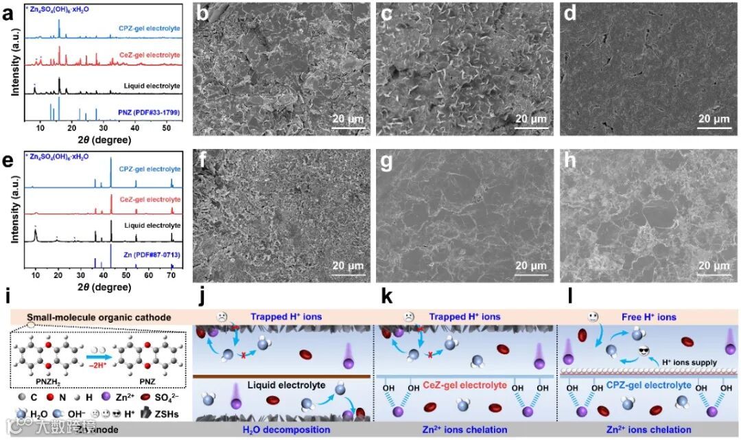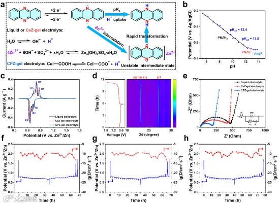 在基于有机小分子正极材料的AZBs研究中,电池容量衰减通常被归咎于有机活性材料的溶解。然而,作者通过紫外–可见光谱分析发现,PNZ在初始状态下几乎不溶,且H+离子嵌入还可进一步可降低其溶解性。电极表面SEM照片表明,电池充放电后,液体电解质中的PNZ正极和Zn负极表面均出现ZSHs片状沉积物,而CPZ-gel电解质中的正负极则无此现象,显然这与电池循环稳定性的改善密切相关。液体电解质中,H+离子的部分不可逆嵌入和析氢副反应分别导致正负极界面pH值升高,形成ZSHs副产物。在循环过程中,界面上ZSH副产物的逐渐积累会阻碍电子和离子传输,降低正负极反应动力学和循环稳定性。CeZ-gel电解质虽然能够抑制锌负极表面ZSHs的形成,但对PNZ正极无效。而在引入PAA涂层后,CPZ-gel电解质不仅在锌负极具与CeZ-gel电解质相同的功能,而且还能通过持续供应H+离子来抑制PNZ正极上ZSHs的产生,从而实现最佳的电池性能。