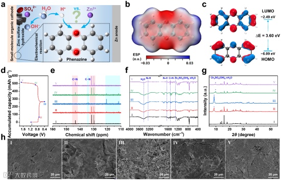 尽管PNZ作为AZBs的有机正极材料已有报道,但其电化学反应机制仍存争议。一些研究主张Zn2+与PNZ2–的结合/解离反应在电化学过程中起主导作用。但作者认为,C‒N‒基团的强碱性应该更倾向于与H+离子结合。作者通过理论计算和一系列实验技术(包括核磁、红外、X射线衍射、X射线光电子能谱和电感耦合等离子体原子发射光谱)证实,在PNZ的氧化还原过程中,H+离子的嵌入和脱出起主导作用,并伴随ZSHs的沉积和溶解。在充电过程中,部分H+离子未能从活性材料中可逆地脱出,导致ZSHs在正极积累,从而增大电池内阻,降低电池循环稳定性。