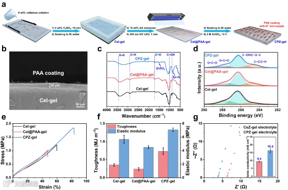 水系Zn||PNZ电池在负极侧面临锌枝晶生长和析氢副反应的问题,在正极侧面临消耗H+离子和沉积ZSHs的问题,这些问题都有望通过电解质的合理设计来解决。为此,作者通过在纤维素水凝胶(Cel-gel)基底上涂覆聚丙烯酸(PAA)层开发了羧酸化的纤维素水凝胶电解质(CPZ-gel)。截面SEM照片表明PAA层均匀覆盖在Cel-gel表面,厚度约为30 μm。红外光谱和X射线光电子能谱表明PAA是通过共价键接枝到纤维素分子上。CPZ-gel展现出卓越的机械性能,韧性和弹性模量分别达到0.73 MJ m−3和7.09 MPa,这主要得益于PAA链的配位交联和纤维素链的氢键作用。羧基基团的负电荷增强了Zn2+离子的迁移和扩散,使CPZ-gel的离子电导率达到16.4 mS cm−1。此外,CPZ-gel在引入PAA涂层后仍可在自然环境中降解(12周),显示了其在大规模储能应用中的可持续性与可回收性。