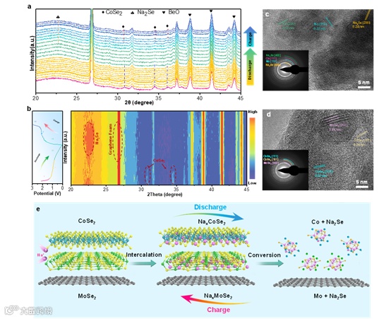 此外,通过in-situ XRD与ex-situ TEM探究了CoSe2/MoSe2@NC/GF的电化学反应机理,证明了其可逆的电化学过程,揭示了其储钠机理,具体如下: