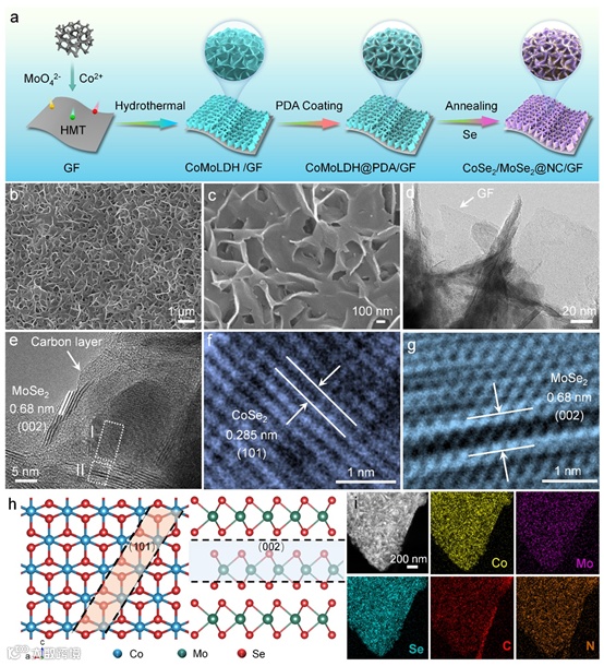 以CoMoLDH作为前驱体,通过碳包覆和气相硒化的方法,制备了具有蜂窝纳米结构的 CoSe2/MoSe2@NC/GF 三维自支撑电极。通过SEM和TEM研究了所得样品的形貌和微观结构。经PDA包覆和Se退火后,制备得到的CoSe2/MoSe2@NC/GF为片状网络结构。涂覆无定形碳的CoSe2/MoSe2@NC/GF纳米片在GF上锚定良好。高分辨率透射电镜(HRTEM)图像显示MoSe2、CoSe2和碳层之间存在明显的界面,这证实了MoSe2和CoSe2在单片上相互交错形成纳米级异质结构。高分辨率高角度环形暗场STEM图像和元素映射图像显示Co、Mo、Se、C和N元素在CoSe2/MoSe2@NC/GF中的均匀分布(图2i)。