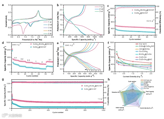 图4. CoSe2/MoSe2@NC/GF用于SIBs负极的电化学性能探究。