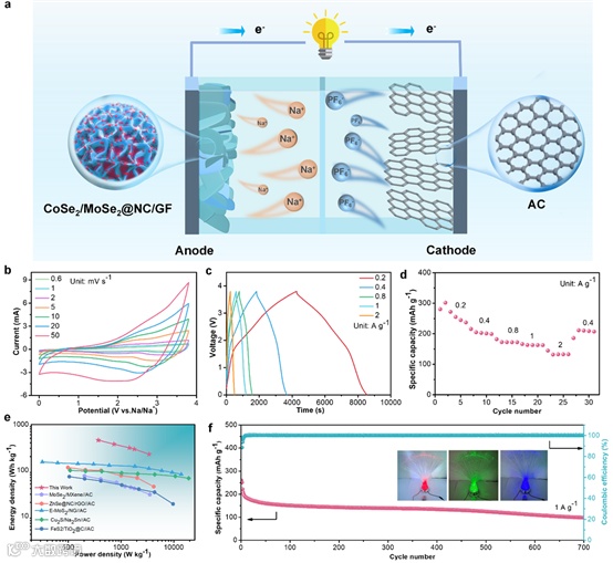 考虑到CoSe2/MoSe2@NC/GF电极用于钠存储的显著倍率性能和循环稳定性,本工作进一步使用活性炭(AC)与CoSe2/MoSe2@NC/GF组装了钠离子混合电容器(SIHC),以进一步评估其实用性。所组装钠离子混合电容器具有较高的功率密度和能量密度,优于大多数报道的金属硫族化合物基材料。此外,SIHC具有显著的长期可循环性,在700次循环后具有98.3 mAh g−1的可逆容量且可以长期点亮LED灯,进一步证明了该SIHC在实际应用中的巨大潜力。