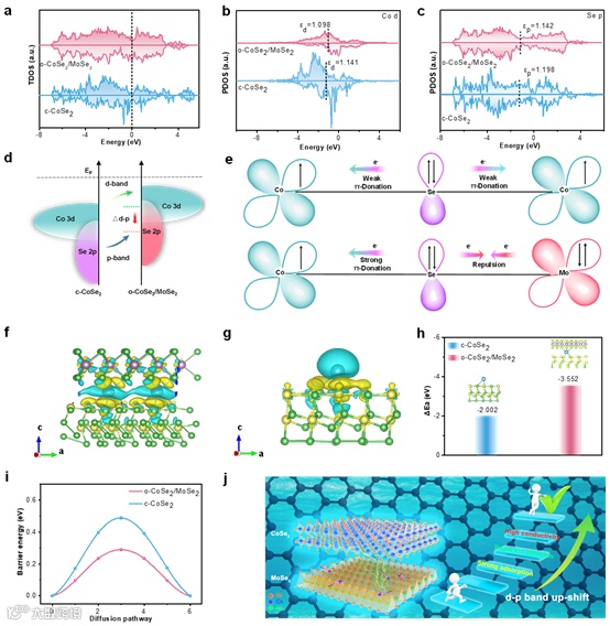 理论计算结果表明,与MoSe2耦合后,o-CoSe2/MoSe2的∆d-p带中心间隙降低(0.044 eV),极大地改善了电子传递和氧化还原动力学。o-CoSe2/MoSe2的d带中心的上移可能归因于电子在异质界面中的重新分布。由于CoSe2中Co阳离子的电子结构通常处于低自旋状态(t2g6eg1),接近最佳eg填充,这使得Co阳离子能够通过𝜋-donation与桥接Se2−相互作用。相反,MoSe2中Mo阳离子的 t2g d轨道被完全占据。因此,Mo阳离子与桥接Se2-之间的主要相互作用是电子排斥。在桥接的o-CoSe2/MoSe2异质界面中,Co阳离子和Mo阳离子耦合后,Mo与Se2−之间的斥力会增强Co阳离子与Se2−之间的𝜋-donation,导致Mo电子部分转移到Co。DFT结果证实了异质界面对d/p中心协同作用的优点,该界面可以实现离子吸附和扩散动力学的良好平衡。