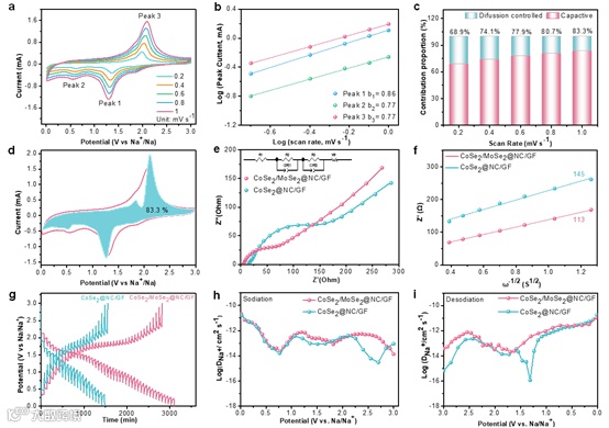 图5. CoSe2/MoSe2@NC/GF中储钠行为的动力学分析。