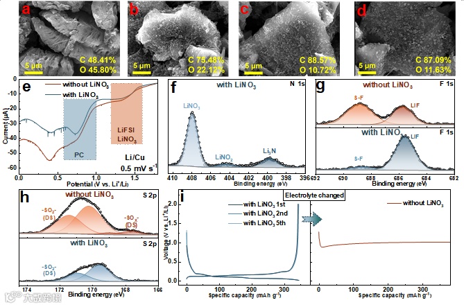 图 2. 在 LiFSI 电解质中循环/放电的石墨负极的 SEI 分析。石墨电极(a)在不含 LiNO3的电解液中放电,在含 LiNO3的电解液循环(b)10周、(c)20周和(d)30周的 SEM 图像。(e)不同电解液的LSV。石墨在不同电解质中循环30周后的(f)N 1s、(g)F 1s 和(h)S 2p的XPS 谱图。(i)电解质交换前后 Li/石墨半电池的充放电曲线。