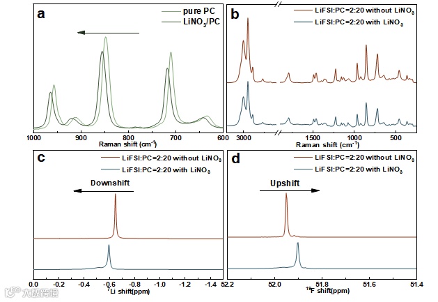 图 3. 体相溶剂化结构。(a)纯 PC 和饱和LiNO3的PC的拉曼光谱,不含/含LiNO3的电解液的(b)拉曼光谱,(c)7Li NMR 和(d)19F NMR 波谱。
