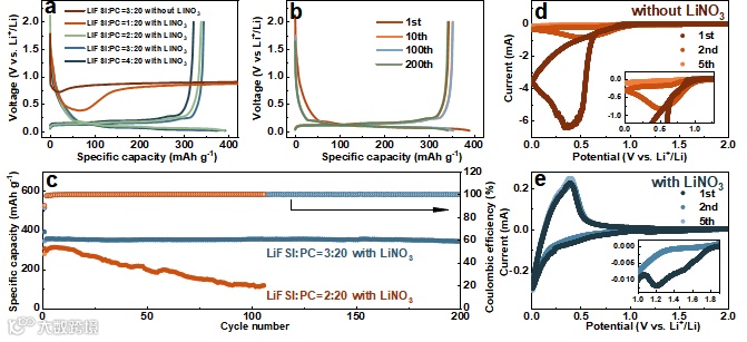 图 1. Li/石墨半电池的电化学性能。(a)不同电解液的首周充放电曲线(50 mA g–1)。(b)含 LiNO3的LiFSI: PC = 3: 20电解液的典型充放电曲线。(c)含 LiNO3的不同锂盐浓度电解液的长循环稳定性。(d)不含 LiNO3和(e)含 LiNO3的电解液在0.1 mV s–1扫速下的 CV 曲线。