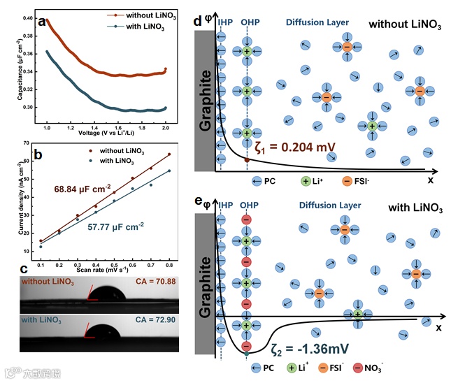 微分电容曲线在 1.0~2.0 V 的电压范围内,EDL 的总电容在添加 LiNO3后时降低。这表明 NO3– 阴离子参与石墨表面的 EDL 结构,导致 EDL 厚度增加和电容减小(图 5a)。电化学活性表面积 (ECSA) 容量也显示,添加 LiNO3后电容减小,这与微分电容曲线的结果一致(图 5b)。添加 LiNO3后,接触角没有显著变化,这表明NO3–阴离子不会改变内亥姆霍兹层(IHP),因为接触角主要由 PC 溶剂分子在石墨表面的特异性吸附决定(图 5c)。加入LiNO3后的zeta 电位由 0.204 mV 变成–1.36 mV 的负值。这表明 NO3– 阴离子吸附在石墨的 OHP 中,使表面电荷从正电荷变为负电荷(图 5e)。应该注意的是,NO3–吸附的位置在 OHP 而不是 IHP。石墨表面的 NO3–吸附显著改变了 OHP 和 EDL 结构。因此,石墨界面附近的 Li+溶剂化结构受NO3– 的调节,促进了 Li+脱溶剂化过程。