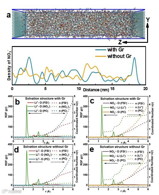 图 4. LiNO3吸附的表征。(a)两个平行石墨电极之间 PC 基电解质中 LiNO3分布的 MD 模拟。有石墨的(b)Li+和(c)NO3–的径向分布函数和没有石墨的(d)Li+和(e)NO3–的径向分布函数。