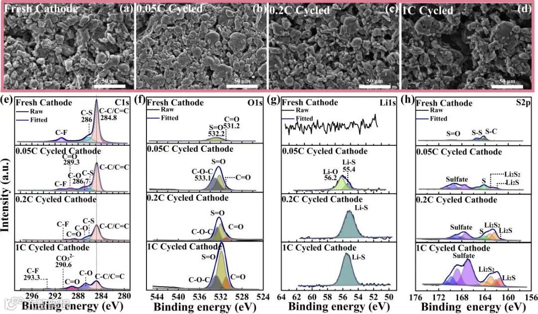 图3.正极在(a)原始状态,(b)0.05C,(c)0.2C和(d)1C活化状态下的SEM图像。活化三圈后正极的XPS谱图。(e)C1s,(f)O1s,(g)Li1s,(h)S2p。