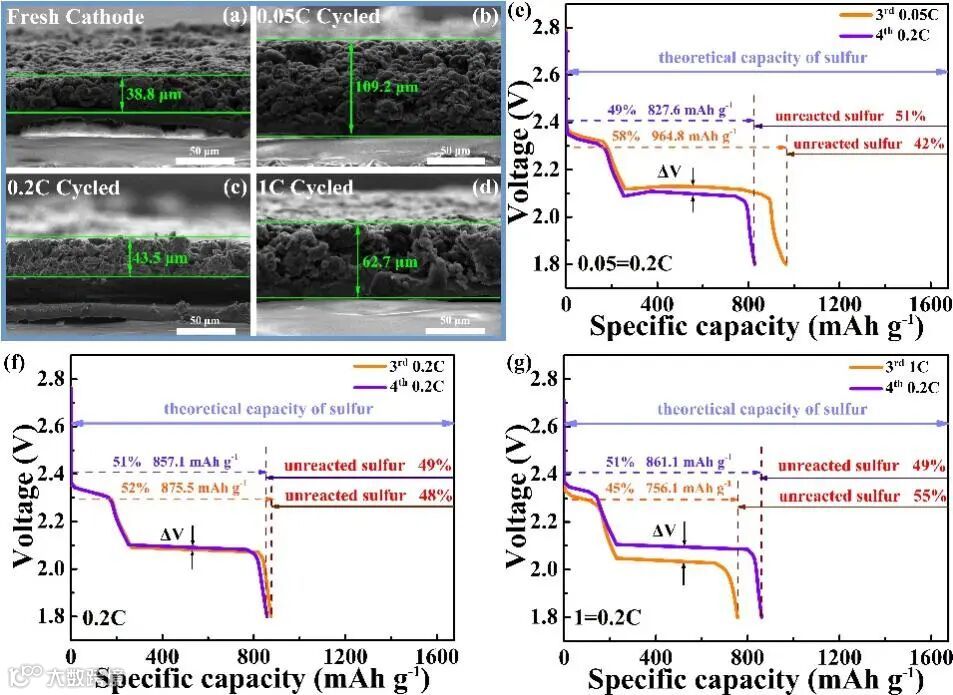 图4.正极在(a)原始状态(b)0.05C(c)0.2C和(d)1C下活化后的横截面图像。(e)0.05C电池,(f)0.2C电池和(g)1C电池的第三次和第四次放电曲线比较。