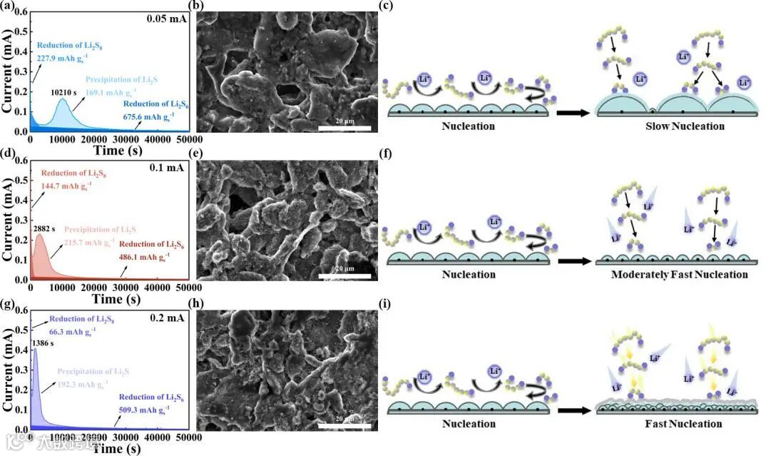 图6.基于不同电流密度的Li2S成核测试(a)0.05 mA(d)0.1 mA(g)0.2 mA。不同电流密度下Li2S沉积形态的SEM图像(b)0.05 mA(e)0.1 mA(h)0.2 mA。不同活化过程中不同沉积机理的示意图(c)低电流(f)恒流(i)高电流。