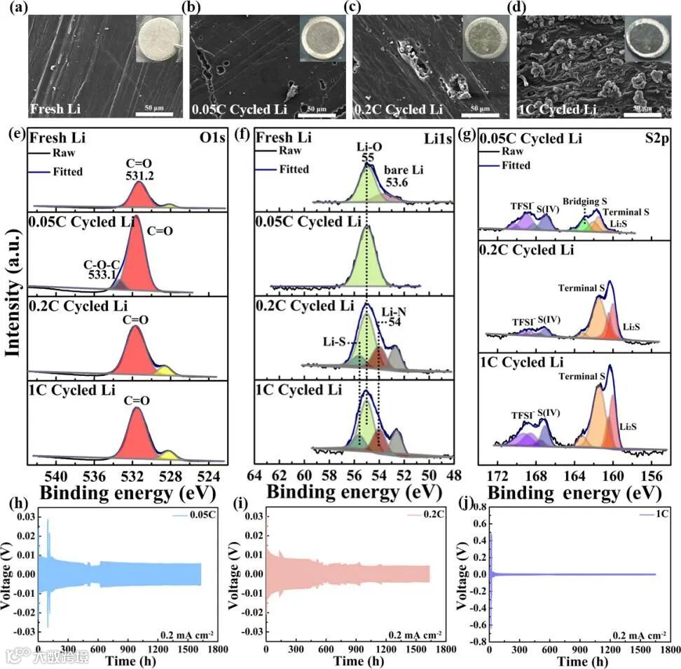 图2.(a)原始锂箔SEM图像。在Li-S电池中(b)0.05,(c)0.2和(d)1C活化3圈后对应Li负极的SEM图像。从活化后的Li-S电池拆卸的Li箔(e)O1s,(f)Li1s,(g)S2p的XPS谱图。(h)0.05,(i)0.2和(j)1C活化后,Li负极重组Li//Li电池的嵌锂/脱锂的极化电压曲线。