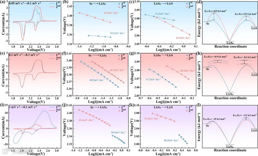 图5.(a)0.05 mV s-1(e)0.1 mV s-1和(i)1 mV s-1不同初始扫描速率下测试Li-S电池的CV曲线,三个电池的第2圈扫描速率为0.1 mV s-1。(b)-(c)在0.05-0.1 mV s-1扫速下的电池从S8-Li2Sn和Li2Sn-Li2S的还原过程的Tafel图,(d)S8-Li2Sn和Li2Sn-Li2S转化的相对活化能。(f)-(g)0.1-0.1 mV s-1扫速的电池S8-Li2Sn和Li2Sn-Li2S还原过程Tafel图,(h)S8-Li2Sn和Li2Sn-Li2S转化的相对活化能。(j)-(k)1-0.1 mV s-1扫速的电池S8-Li2Sn和Li2Sn-Li2S还原过程Tafel图,(l)S8-Li2Sn和Li2Sn-Li2S转化的相对活化能。