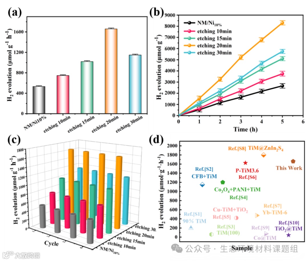 图4 (a)不同样品的制氢性能图;(b)不同样品5小时的制氢性能图;(c)不同样品制氢的循环稳定性测试;(d)TiO2@Ti MOFs的制氢性能与其他光催化剂的比较。(图中的TiM是Ti MOFs的缩写)。