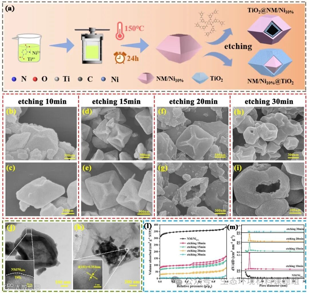 图2 (a)TiO2@Ti MOFs和Ti MOFs@TiO2的合成路线示意图;(b-i)经过不同时间刻蚀的TiO2@Ti MOFs的SEM图像;(j, k)TiO2@Ti MOFs刻蚀20分钟的TEM图像;(l)N2吸附-解吸等温线;(m)不同刻蚀时间下光催化剂的孔径分布。