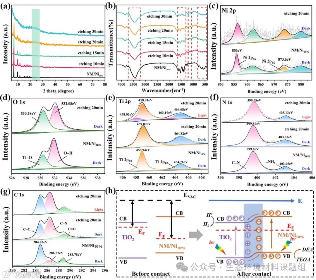 图3 (a)不同刻蚀时间的TiO2@Ti MOFs的XRD图谱和(b)傅立叶变换红外光谱;(c)黑暗条件下Ti MOFs和TiO2@Ti MOFs的Ni 2p和(d)O 1s XPS光谱;在黑暗和光照条件下Ti MOFs和TiO2@Ti MOFs的(e)Ti 2p;(f)N 1s;(g)C 1s XPS光谱;(h)Ti MOFs和TiO2之间的电子转移示意图。