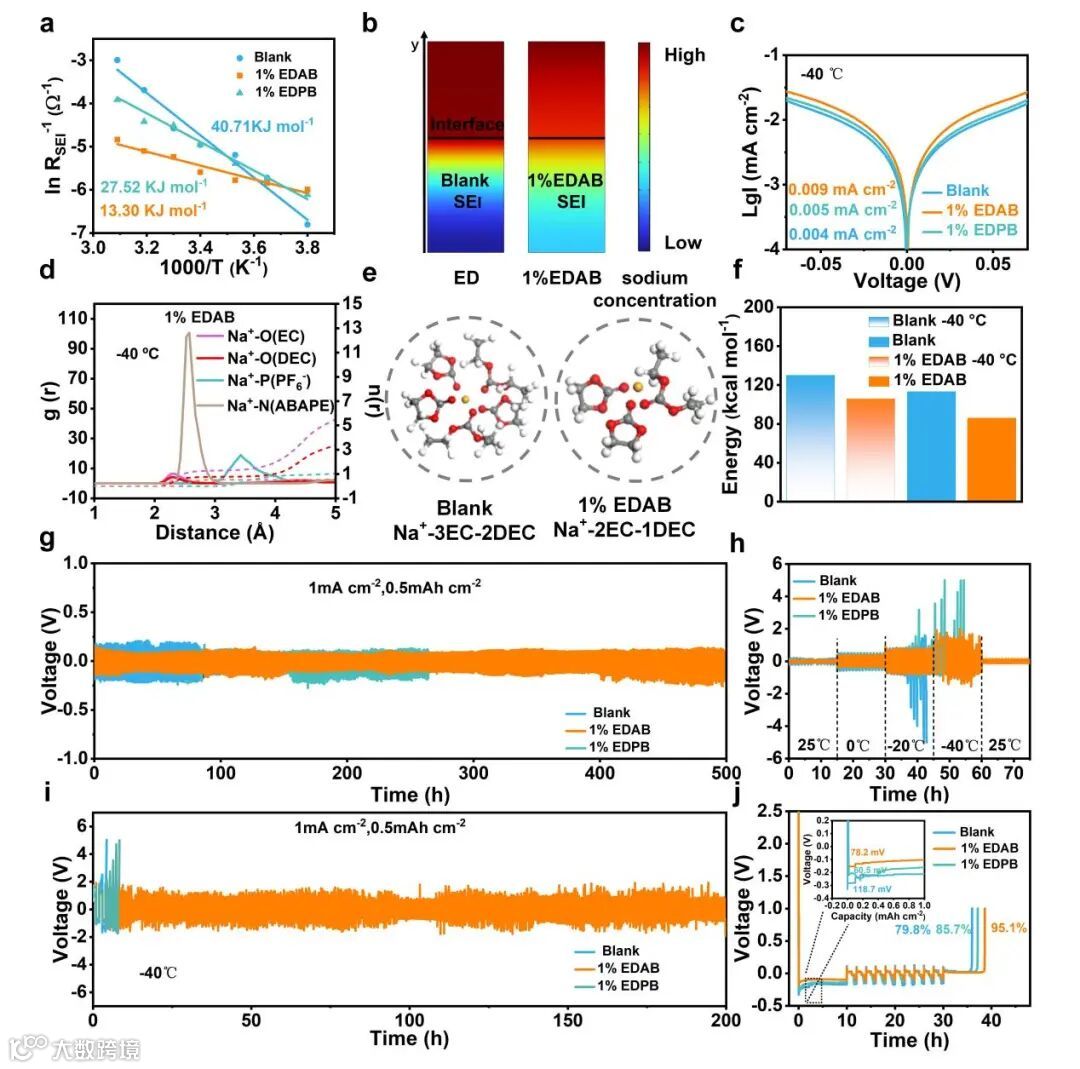 图3. a)Na+在Blank、1% EDAB和1% EDPB中通过SEI层的扩散活化能Ea. b) 在Blank和1% EDAB中Na+浓度的有限元模拟。c) -40℃时Tafel曲线。d) 1% EDAB电解液在-40℃时的径向分布和配位数。e) 代表性溶剂化结构。f) 去溶剂化能。在g) 室温和i) -40°C条件下,三种电解液的Na||Na对称电池的循环性能。h) 三种电解液在不同温度下对称电池的电压-时间曲线。j) Na||Cu半电池的库仑效率