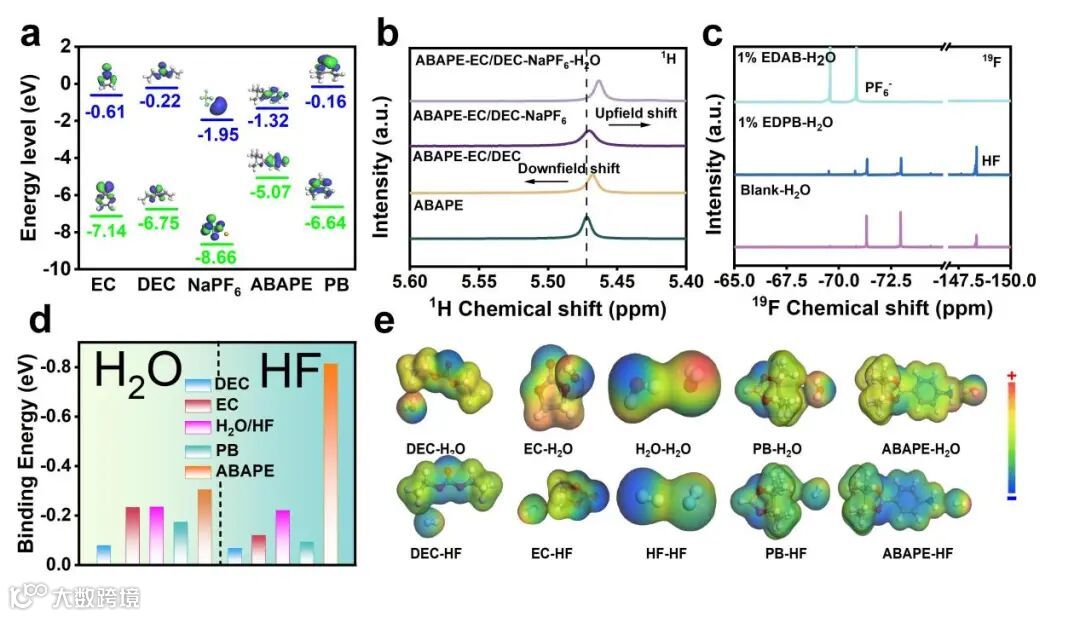 图2.a)通过DFT计算溶剂的分子轨道能级。B)纯ABAPE和不同有机溶液组分的1H NMR谱。c)三种电解液在加入2 vol%后的19F NMR谱水d)添加剂、溶剂和H2O(HF)之间的结合能,以及H2O(HF)和相邻H2O(HF)之间的结合能。e)相互作用分子的静电势(ESP)和电子密度。