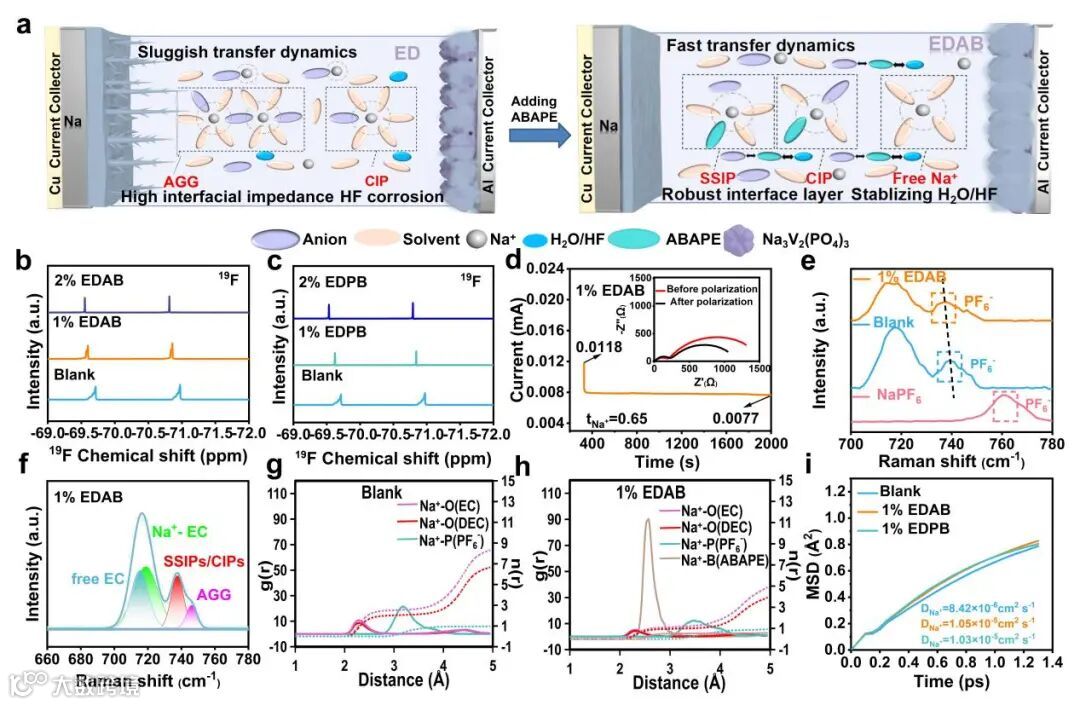 图1。a) ABAPE添加剂在SMBs中对电解液结构的影响机理及沉积效果示意图。b) 空白电解质、1% EDAB和2% EDAB的19F NMR谱。c) 1% EDPB和2% EDPB的19F NMR谱。d) 在1% EDAB中施加10 mV极化后的电流与时间曲线。e) P-F键的拉曼光谱。f) 1% EDAB中不同聚集团簇中EC和PF6-的拉曼光谱。g) Blank和h) 1% EDAB中Na+周围溶剂和阴离子的径向分布和配位数。i) 三种电解液中Na+扩散系数。