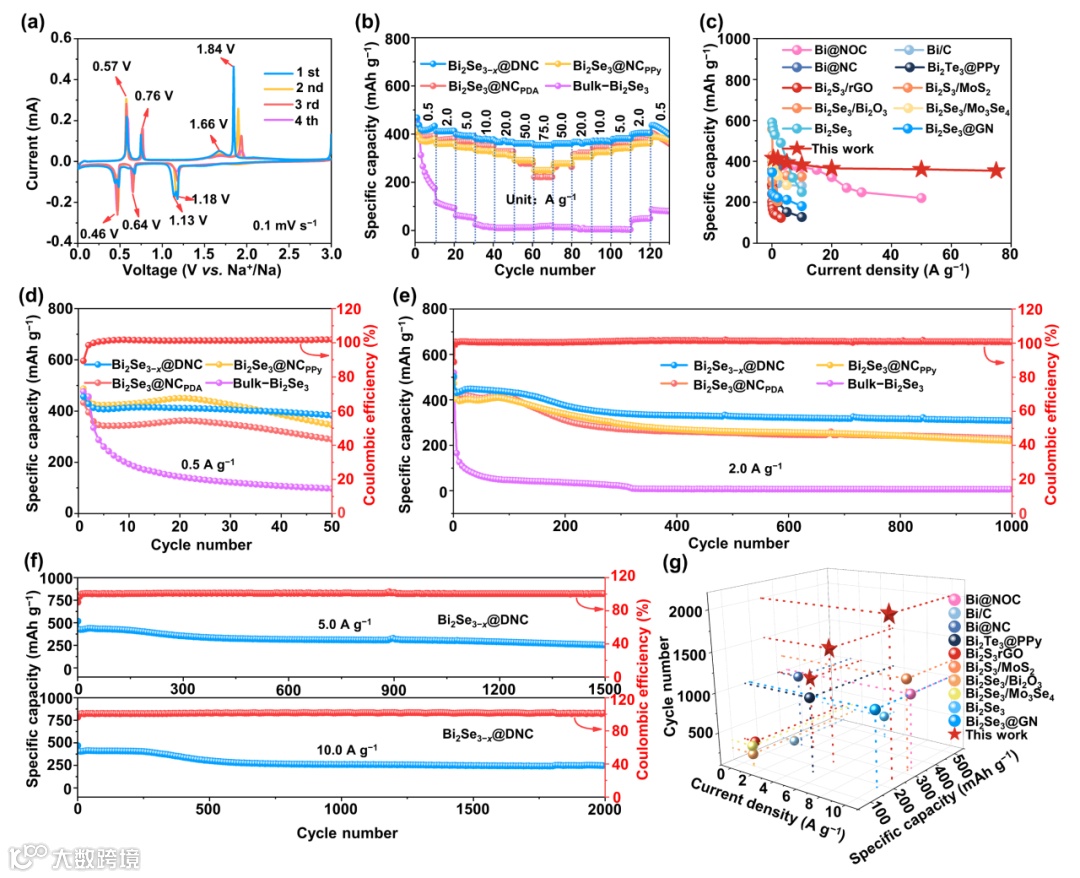 Bi2Se3−x@DNC, Bi2Se3@NCPPy, Bi2Se3@NCPDA, and Bulk−Bi2Se3的 (b) 倍率性能,(d) 在0.5 A g−1的循环性能和 (e) 在2.0 A g−1的循环性能。(f) Bi2Se3−x@DNC在5.0 A g−1和10.0 A g−1的循环性能。Bi2Se3−x@DNC与其他已报告Bi基负极的倍率 (c) 和循环性能 (g) 的对比。