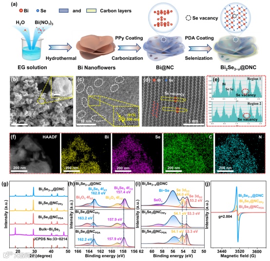 Bi2Se3−x@DNC, Bi2Se3@NCPPy, Bi2Se3@NCPDA和 Bulk−Bi2Se3的 (g) XRD 图谱。Bi2Se3−x@DNC, Bi2Se3@NCPPy, Bi2Se3@NCPDA 的 (h) Bi 4f和 (i) Se 3d的高分辨率 XPS光谱,(j) EPR 谱图。