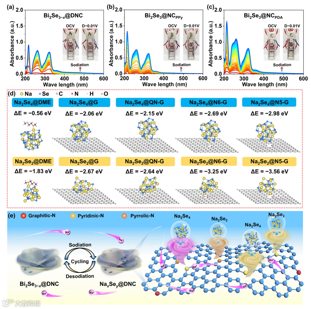 图5. (a) Bi2Se3−x@DNC, (b) Bi2Se3@NCPPy和 (c) Bi2Se3@NCPDA为原位UV-vis吸收光谱。(a-c)的内插图分别是为了收集放电前和放电后的原位UV-vis吸收光谱的电解槽。(d) Na2Se2和 Na2Se4团簇分别吸附在 DME 分子和不同石墨烯衬底上的立体图。(e) Bi2Se3−x@DNC中N掺杂碳基体在长循环过程中的示意图。