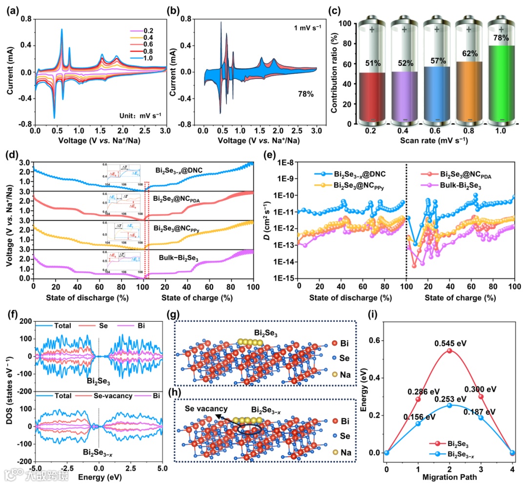 图3. Bi2Se3−x@DNC电极在 (a) 不同扫速下的CV曲线,(b) 1.0 mV s−1扫速下的赝电容贡献,(c) 对应的贡献比。Bi2Se3−x@DNC,Bi2Se3@NCPPy,Bi2Se3@NCPDA和Bulk−Bi2Se3电极的 (d) GITT曲线,(e) 计算的钠离子扩散系数。Bi2Se3−x 和 Bi2Se3的 (f) 态密度,(g-h) 钠离子扩散路径和 (i) 钠离子扩散能垒。