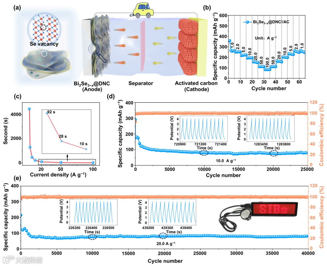 为了进一步评估其实际应用,以商业活性碳为正极,Bi2Se3−x@DNC为负极组装钠离子混合型电容器。组装好的混合电容器显示出高的倍率容量(在100.0 A g−1下有83.3 mAh g−1 )和超过40000次循环的超长寿命,使Bi2Se3−x@DNC电极成为SIB的有前景的候选者。