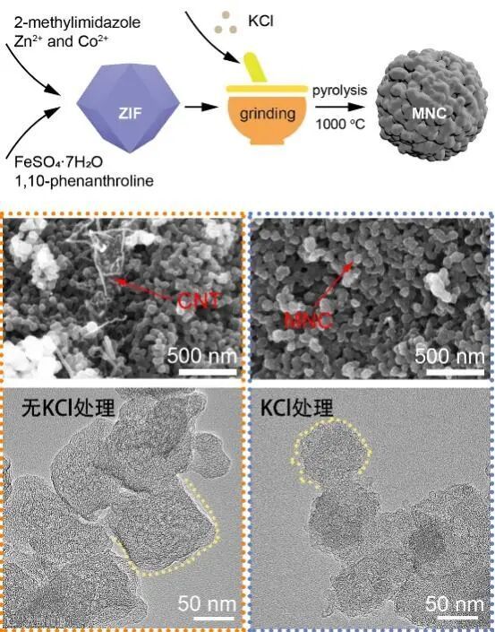 对于碳化过程中未添加KCl的样品(简写为MNC0),产物是以碳颗粒和碳纳米管的混合状态存在的,且颗粒尺寸不均匀。相比之下,加入KCl的样品(简写为MNC5)中碳颗粒的尺寸非常均匀,没有发现碳纳米管的存在。与此同时,在ZIF与KCl球磨和高温处理之后,碳颗粒边缘相对粗糙,这可能为Pt纳米颗粒的负载提供更多位点。在高温处理过程中KCl的作用可以归结为两个方面:①熔融氯化钾对ZIF颗粒起到分隔作用,抑制Co、Fe原子团聚成纳米颗粒;②高温条件下K离子的插层效应,打破了ZIF的边界,获得更大的外比表面积。