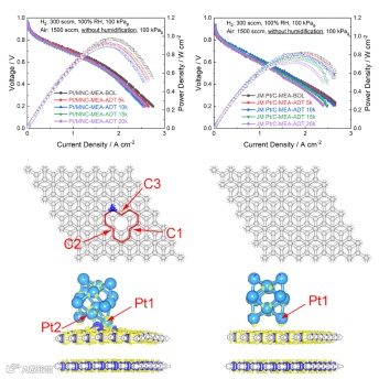 为了进一步研究该催化剂在PEMFC中的稳定性,本研究在氢气-空气条件下进行了电压脉冲测试。在ADT过程中,每5000次循环记录一次Pt/MNC-MEA的极化曲线。与原始MEA相比,经过20000次ADT循环后,Pt/MNC-MEA的MPD衰减率仅为7.4%,小于JM Pt/C-MEA的衰减率(11.8%),表明该催化剂在PEMFC应用过程中具有出色的稳定性。模拟结果表明,Pt纳米团簇很容易被石墨烯上的缺陷捕获,在Pt1与C1/C2/C3原子和Pt2与C3原子之间形成稳定的化学键。对于石墨N掺杂的缺陷石墨烯,Pt2和C3之间的键长从2.195 Å进一步减小到2.110 Å,表明载体与Pt纳米团簇之间的束缚增强,这为Pt/MNC催化剂在PEMFC应用中的高电化学稳定性提供了合理的解释。