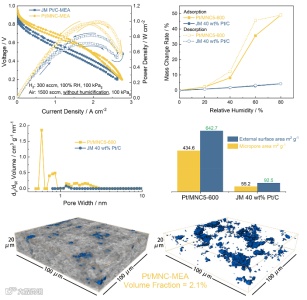 Pt/MNC-MEA的开路电压(0.967 V)远高于商业Pt/C-MEA的0.900 V。随着电压的降低,商业Pt/C-MEA的功率密度增加到0.72 W cm-2。然而,当电池电压从0.20 V反向扫描到0.95 V时,功率密度进一步增加到0.82 W cm-2,这是由于在高电流密度范围内产生了大量的水,导致膜的离子电导率较高。相比之下,Pt/MNC-MEA的功率密度在正向扫描(0.95 ~ 0.20 V)时达到最大值(1.00 W cm-2),当电池电压从0.20 V反向扫描至0.95 V时,Pt/MNC-MEA的最大功率密度略有下降,为0.97 W cm-2,说明Pt/MNC5-600催化剂在极端干燥条件下,依然表现出优异的电化学活性。Pt/MNC5-600催化剂优异的自保湿能力主要源于超大的微孔体积,使该催化剂具有极强的吸水能力(0.49 gwater gCat-1),超过商业Pt/C催化剂10倍以上。同时,显微CT扫描显示Pt/MNC-MEA的催化层疏松多孔,这都为催化层在干燥条件下的储优秀水能力提供支持。