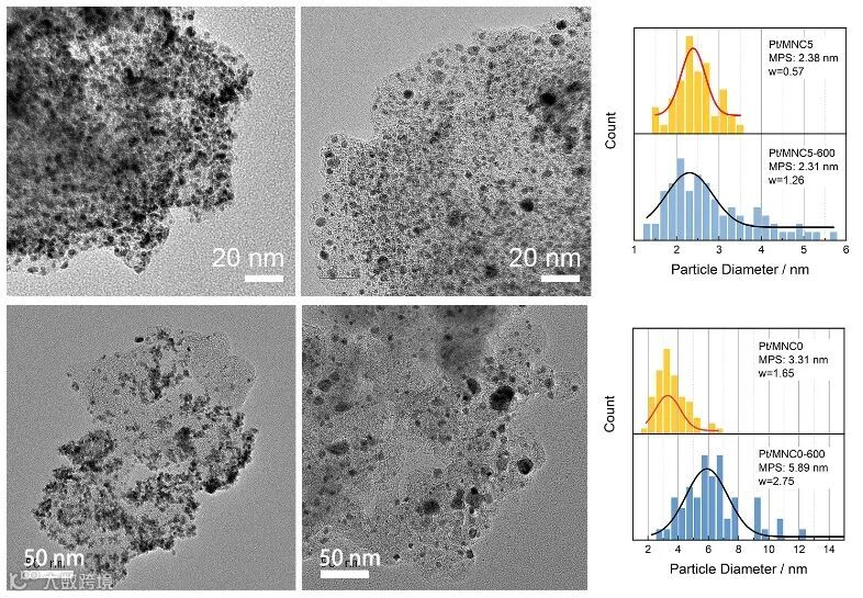 MNC5上Pt纳米颗粒的平均粒径(MPS)仅为2.38 nm,小于Pt/MNC0的平均粒径。在H2/Ar气氛下600℃退火后,Pt/MNC0-600的MPS提高了78%。对于Pt/MNC5-600来说,Pt纳米与退火处理之前变化不大。这是由于N掺杂的碳缺陷的锚定效应提高了Pt纳米颗粒在退火过程中的稳定性。