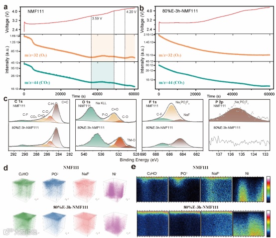 图 4 (a)NMF111和(b)80%E-3h-NMF111的DEMS测试结果。循环100周后(c)NMF111和80%E-3h-NMF111的XPS测试结果。循环100周后 NMF111和80%E-3h-NMF111 TOF-SIMS的(d)3D重构图像和(e)截面2D分布图像。