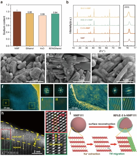图2 各样品的(a)钠含量和(b)XRD图谱。(c-e)改性不同阶段样品的SEM图像。(e)原始态NMF1111和(g)改性样品的HRTEM图像。(h)改性样品的STEM图像,(i)无钠岩盐表面形成过程的示意图。