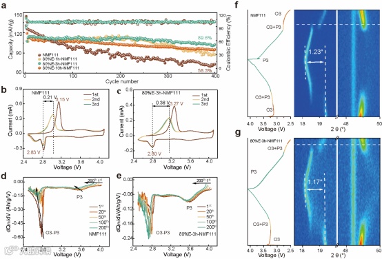 图 3 (a)原始样品和各改性样品的循环性能。(b)NMF111和(c)80%E-3h-NMF111的CV曲线。(d)NMF111和80%E-3h-NMF111的dQ/dV曲线。(f)NMF111和(g)80%E-3h-NMF111的原位XRD图谱和对应的充放电曲线。