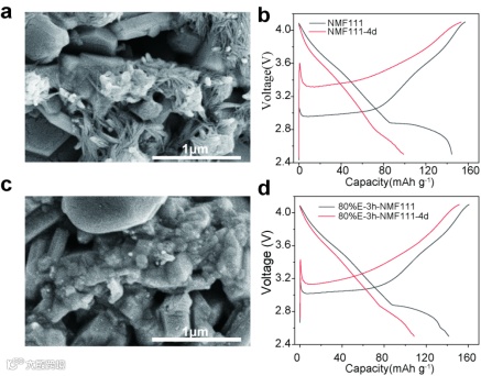 图 5 NMF111和80%E-3h-NMF111空气中储存4天后的(a,c)SEM图像和(b,d)对应的充放电曲线。