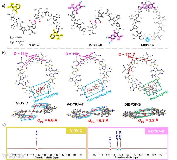 Figure 1. (a) Chemical structures of V-DYIC, V-DYIC-4F, and DIBP3F-S. (b) The top- and side-view of O-shaped V-DYIC, V-DYIC-4F, and DIBP3F-S. (c) 19F NMR spectrum (600 MHz) of S-shaped conformations of V-DYIC and V-DYIC-4F in the C2D2Cl4 solution.