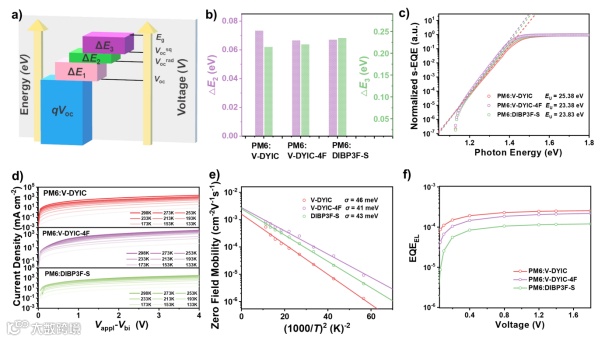 Figure 2. (a) Diagram describing voltage and energy loss. (b) ΔΕ2 and ΔΕ3 energy loss, (c) s-EQE at absorption onset, (d) temperature-dependent space-charge-limited current (SCLC) curves, (e) electron mobility of corresponding devices as a function of 1/T2 using SCLC estimated data, and (f) electroluminescence EQE of optimized devices based on PM6:V-DYIC, PM6:V-DYIC-4F and PM6:DIBP3F-S.