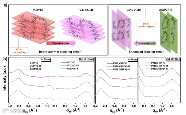 Figure 3. (a) The schematic π-π stacking of V-DYIC and V-DYIC-4F (left), and the schematic lamellar packing of V-DYIC-4F and DIBP3F-S (right). (b) One-dimensional (1D) line cuts of the films based on neat V-DYIC, V-DYIC-4F and DIBP3F-S, and their blends with PM6.