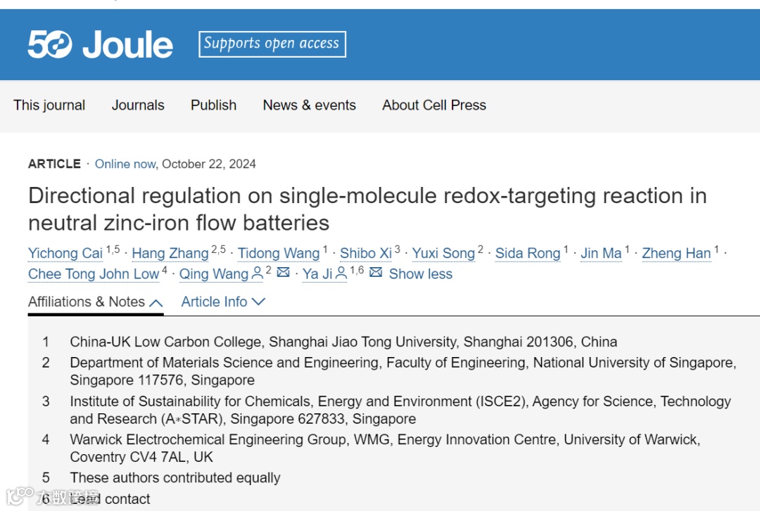Cai, Y., et al. (2024). "Directional regulation on single-molecule redox-targeting reaction in neutral zinc-iron flow batteries." Joule.