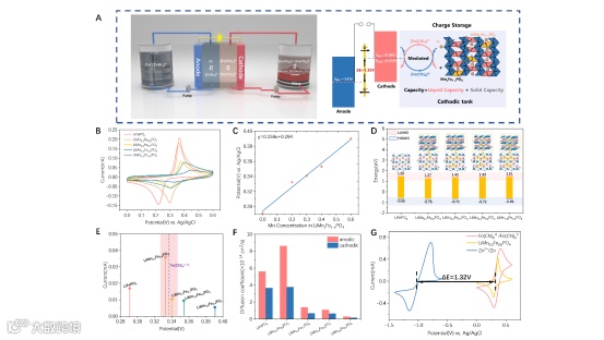 循环伏安法显示,随着锰掺杂量增加,LiMnxFe1-xPO4的氧化还原电位正向移动,且与Mn比例呈线性关系。密度泛函理论(DFT)计算证实了锰掺杂调控氧化还原电位的有效性。LiMn0.2Fe0.8PO4展现了最佳的电化学活性和与[Fe(CN)6]3-/4-匹配的氧化还原电位(0.333 V vs. Ag/AgCl),被认为是构建中性水系SMRT系统的最优材料。Zn2+/Zn则被用作负极,构建了具有大电压窗口的SMRT液流电池。