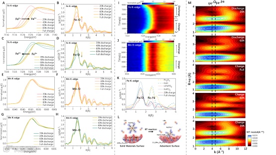 运用原位同步辐射技术,研究Fe和Mn在充放电过程中的配位环境和化学状态变化。XANES和FT-EXAFS结果显示,Fe在充电过程中氧化态逐渐增加,而放电时则恢复。Mn的价态变化不大,主要受到Fe-O相互作用的影响。通过WT-EXAFS光谱比较,观察到充电过程中的Fe-Fe相互作用增强,表明靶向氧化还原反应主要发生在Fe2+/Fe3+之间,由LiMnxFe1-xPO4与[Fe(CN)6]3-/4-之间发生电子转移。