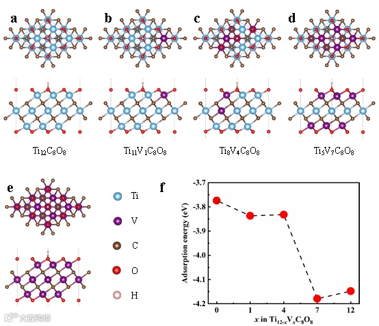 图5f所示所有Ti12-xVxC8O8对H原子的吸附能。可以观察到,随着V掺杂含量的增加,H的吸附能逐渐增强。H的负吸附能越大,表明吸附越容易,从而改善了氢离子或电子在MXene电极和H2SO4电解质之间的转移。因此,计算结果表明,V掺杂不仅提高了电极材料的电化学活性,而且提高了Ti3C2TxMXene的吸附能力。这使得电解质离子更容易吸附在电极材料表面,进一步提高了储能效率和反应动力学。钒掺杂通过优化吸附能,促进电极与电解质更好的相互作用,促进快速的电荷转移过程,最终提高整体电化学性能,这与实验结果一致。与30% V掺杂的样品相比,60% V掺杂的样品理论上应该具有更优越的整体电化学性能。然而,正如在之前的实验中所讨论的,在60% V掺杂的样品中观察到的电化学性能的恶化是由于形成了效率较低的211 MXene次级相。尽管我们的预测表明,纯V3C2Tx MXene应该具有良好的电化学性能,但不幸的是,之前的计算表明,它的母相V3AlC2不稳定,并且没有成功地通过实验合成。
