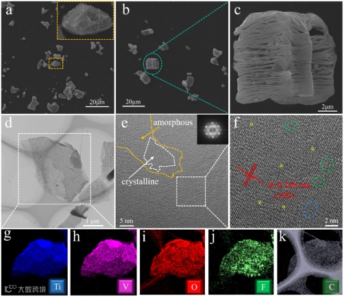 如图1所示Ti,V,Al,C按照不同的摩尔比例采用无压烧结掺杂策略制备(Ti1−xVx)3AlC2 MAX相,然后探索合适的蚀刻工艺,得到新型二维双金属(Ti1−xVx)3C2Tx MXene,并对双金属(Ti1−xVx)3C2Tx MXene的固溶性和相应的物理化学性质进行了系统的研究。刻蚀过后,(Ti1−xVx)3C2Tx MXene微观结构发生了显著变化,图2c扫描图像可以清楚地看到,遮挡的金属Al层被去除,形成了独特的手风琴状形态,表面积增加。从图2f低倍率高分辨率透射图中可以清楚地看到,样品中存在一些缺陷(点缺陷、晶格畸变等),并且可以观察到更多的非晶结。缺陷和非晶结的存在可以增强电极材料的电化学活性,有效地调节电荷传递动力学,增强电荷存储能力。