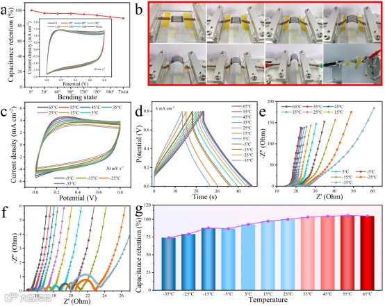 图4b所示(Ti0.7V0.3)3C2Tx-MSCs显示出卓越的机械灵活性,满足柔性可穿戴电子设备的要求。微型超级电容器能否应用于复杂的工作环境,较宽的工作温度范围至关重要,尤其是低温下的电化学性能。通过在PVA−H2SO4凝胶电解质中添加DMSO有机化合物,构建了一种适应其宽工作温度范围的二元溶剂改性凝胶电解质。由于DMSO的高熔点、低凝固点和强交联效应,使得该器件在−35℃−65℃的极端环境中仍能正常运作。图4g清楚地表明,(Ti0.7V0.3)3C2Tx-MSCs的容量在温度变化中保持相对稳定,在−35℃和65℃下的容量保留率分别为74.15%和104.8%。这些结果充分表明,(Ti0.7V0.3)3C2Tx-MSCs器件具有优异的机械灵活性和温度适应性,可以很好地满足微电源在挑战性环境中的需求。