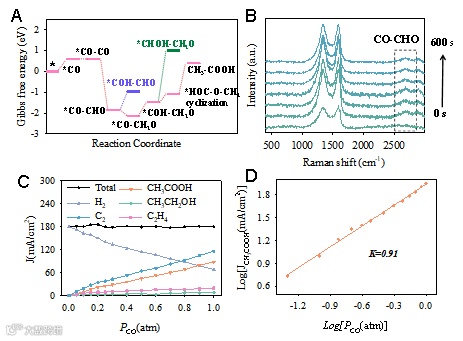 3.DFT计算的结果表明,SA Cu-PNC催化剂C-C耦合遵循E-R机制,并且CO-CO的耦合的能垒很低(ΔG=0.01 eV),这表明*CO与气体CO分子的耦合速率极快;此外反应动力学测试表明,反应物CO的分压与乙酸的分电流密度线性相关(k=0.91≈1),这与反应动力学计算的结果是一致的,这进一步证明SA Cu-PNC在C-C耦合中遵循E-R机制。