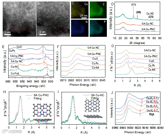 1. 采用磷化氢气体热处理Cu纳米粒子,利用PH3与Cu原子间的强路易斯酸碱效应,将Cu纳米粒子分散为Cu单原子, P原子同时进入Cu单原子的第二壳层,并采用同步辐射模拟和DFT计算结合的方式确定了其Cu-N4-P4/C4的配位结构。